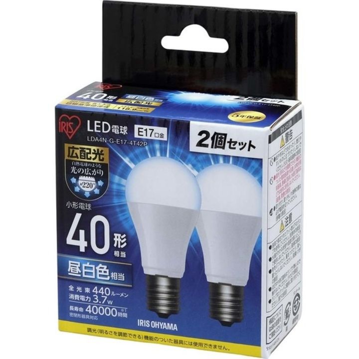 ●商品サイズ(cm)直径約3.5×高さ約7.4●重量:約27g●材質:アルミ、ポリカーボネート、PBT●パッケージサイズ(cm)幅約7.4×奥行約3.7×高さ約7.9●口金サイズ:E17●光色LDA4N-G-E17-4T42P:昼白色相当LDA4L-G-E17-4T42P:電球色相当●定格消費電力:3.7W●定格入力電流:0.062A●全光束:約440lm●配光角:約220度●定格寿命:約40000時間●電源:100V(50/60Hz共用)●使用場所:屋内用●ランプ全体の明るさ:小型電球40W形相当●密閉形器具:○●エネルギー消費効率:118.9lm/W(検索用:LED電球 LED LEDライト 電球 照明 しょうめい ライト ランプ あかり 明るい 照らす ECO エコ 省エネ 節約 節電 キッチン リビング 勉強 交換 4967576290180 4967576290197)